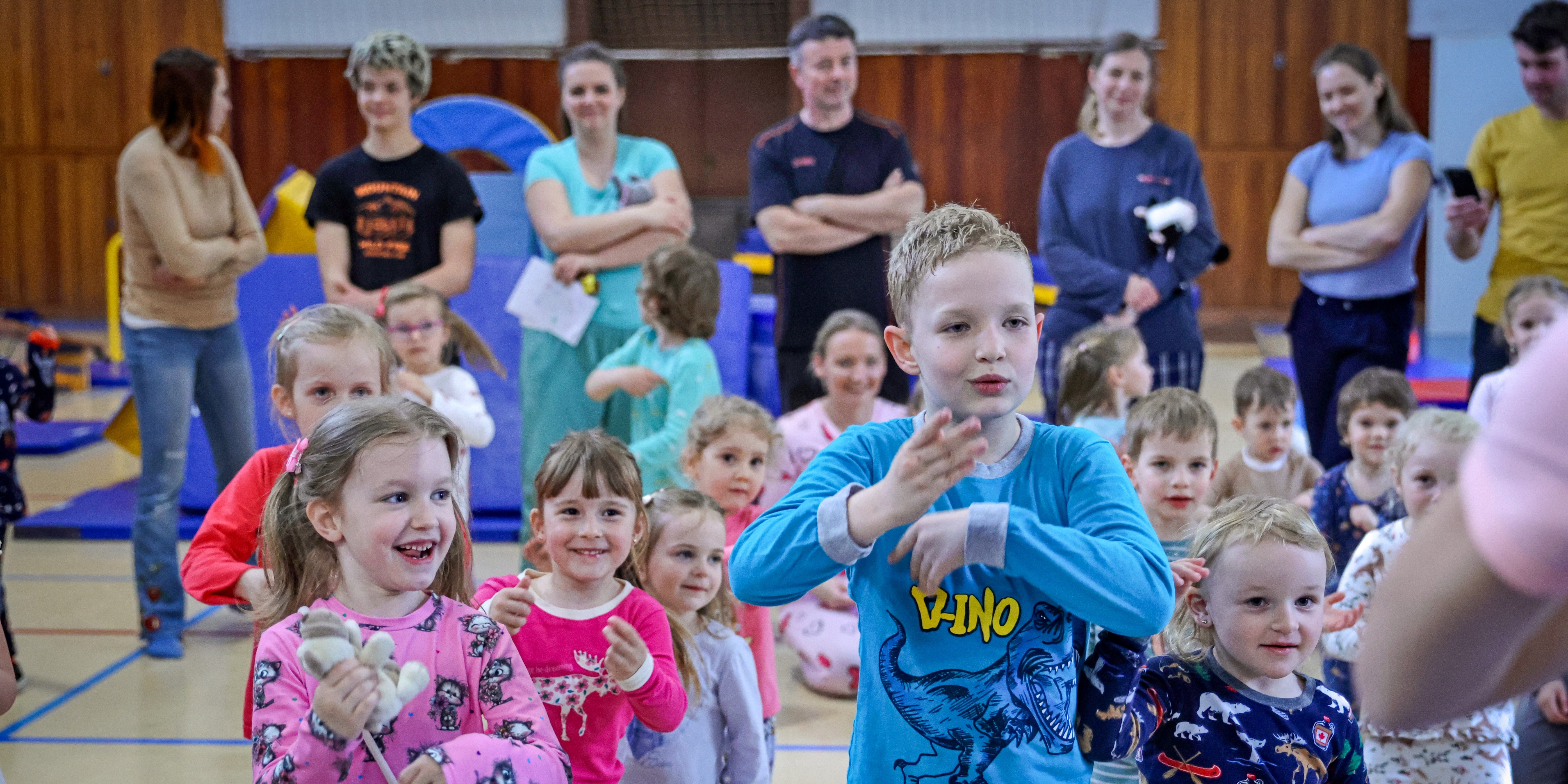 Od 17:30 byl připraven program pro mladší a starší žactvo, který se zahájil taneční lekcí a pokračoval volnou zábavou, kterou účastníci využili ke skákání na malé a velké trampolíně, lezení na horolezecké stěně, hraní “stříhací” hry či pinkání s gymballem. Na závěr nechybělo vyhlášení nejhezčího pyžamového úboru.